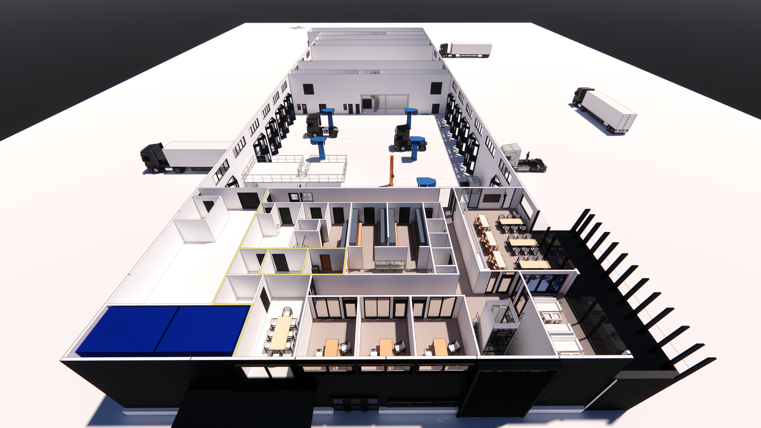 I projektet har stor vikt legat vid de processer, system och utrustning som en lastbilsverkstad behöver. Detta i form av servicegropar, vätskepåfyllning, servicestationer, riktar och traverser.